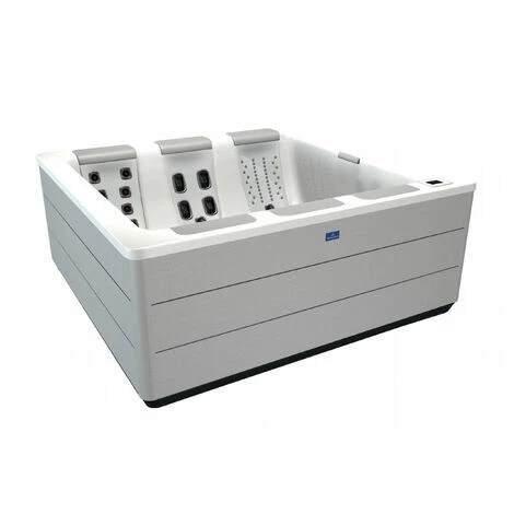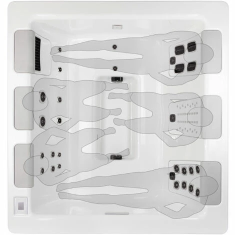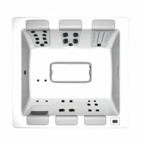 Durch die neuartige Sitzanordnung können in diesem Whirlpool bis zu fünf Personen versetzt gegenüber Platz nehmen und angenehme Beinfreiheit geniessen.